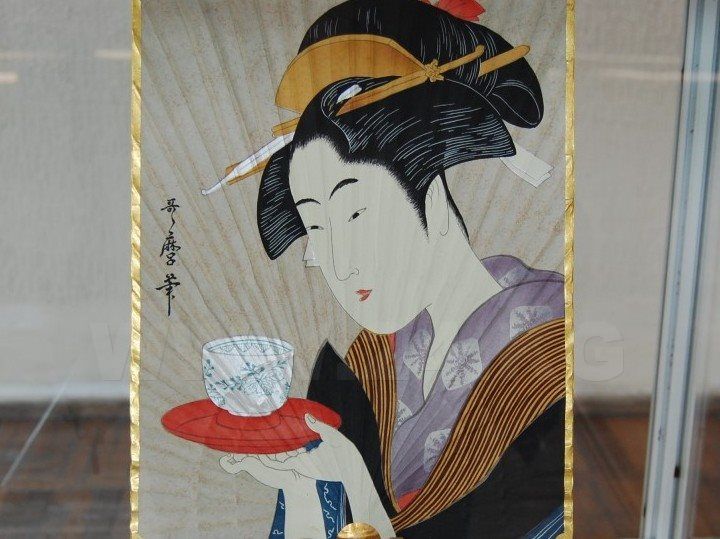 Хочется упомянуть и о больших веерах маругамэ-утива. Их считают чисто японским изобретением. Изготавливался он из цельного куска дерева, затем обтягивался дорогим шелком либо бумагой, на которую наносился изысканный рисунок. Именно три таких веера представлены вниманию посетителей.