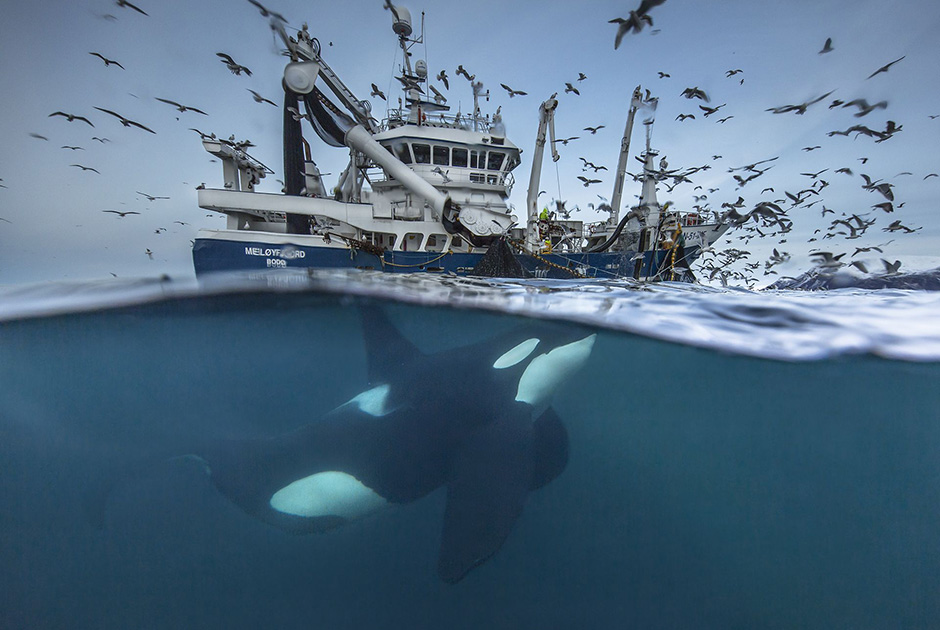 Касатки, привлеченные звуками рыболовецкой лодки, надеются на легкую добычу - сельдь, выловленную людьми. Audun Rikardsen