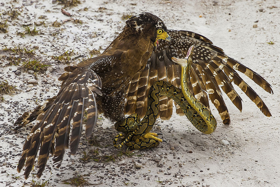Змея пытается защититься от большого хохлатого змееяда. Antonius Andre Tjiu
