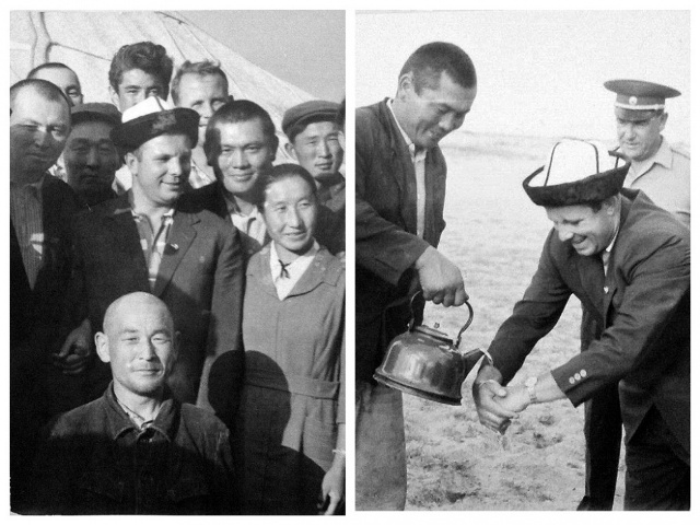 Ак калпакты кийип сүрөткө түшкөндөрдүн арасында биринчи учкуч Юрий Гагарин, кытайлык актер Жеки Чан бар.
