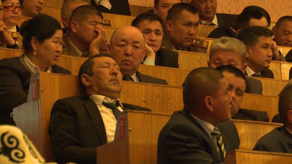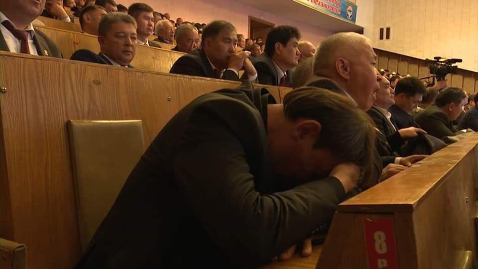 Ош шаарында «Санарип Кыргызстан: региондорду өнүктүрүү» биринчи телекоммуникациялык форумунда бир катар аткаминерлер уктап олтурган сүрөтү таркатылууда.