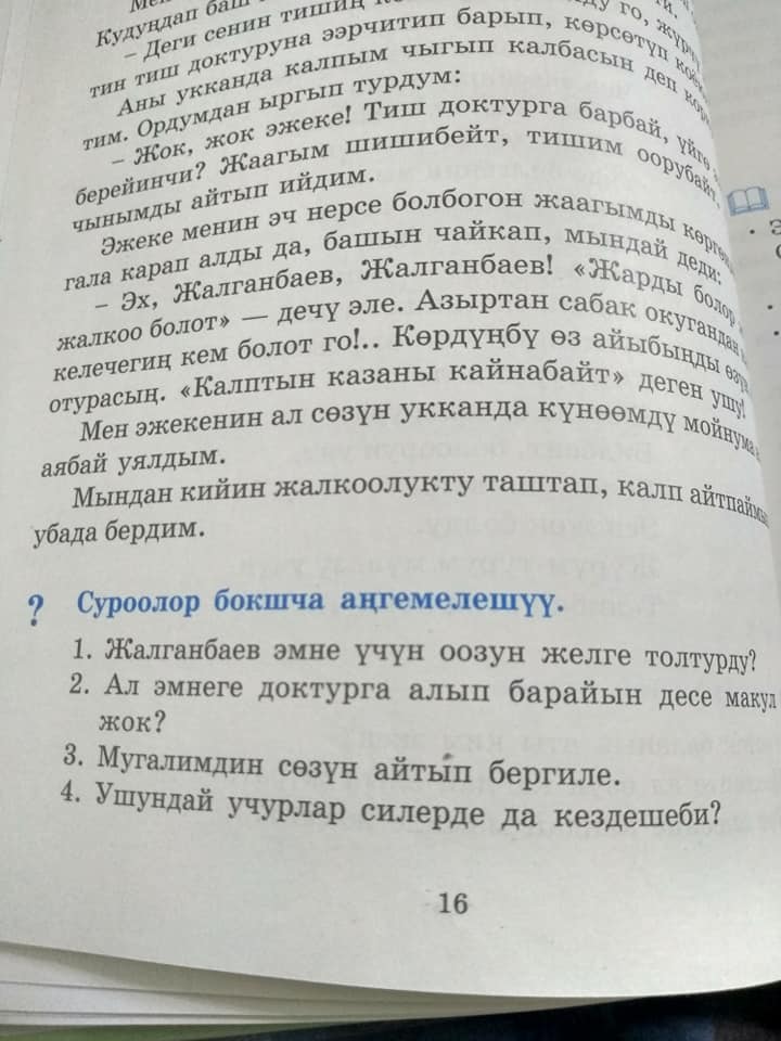 «Мисалы, «боюнча» дегендин ордуна «бокшча» деп жазылган. Ушул эле китептин 17-бетинде «бурима оюну» деп жүрөт. Эмне экенин таба албадык, ким билет?», — деп суроо салган.