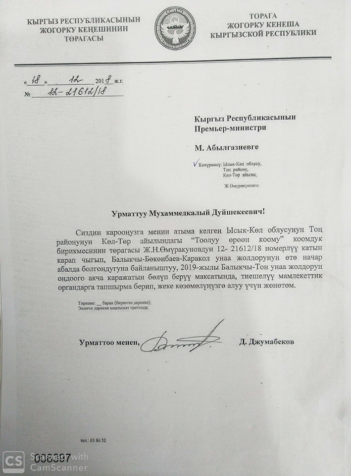«Биз «Тоолуу өрөөн коому» коомдук бирикмеси 12-21612/18 номерлүү катын, Балыкчы-Бөкөнбаев-Тоң унаа жолдорун оңдоого каражат бөлүп берүү жагын сурандык элек. Урматтуу премьер-министр жооп берип койсоңуз, бир жыл болуп баратат. Эт жебесек да, шорпо ичкендей болуп калалык. Урматтуу Дастанбек Артисбекович сиз дагы кайрылып койсоңуз,Тоң эли күтүп жатат», — деп айтылат маалыматта.