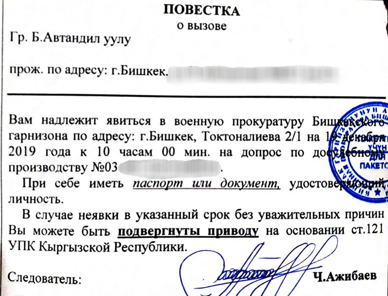 «Чакырууда мени жактоочу менен келүүгө укуктуу болгонумду айтышкан эмес. Ошондой эле келе албай турганымды билдирүү үчүн кандайдыр бир даректер жана телефон номурлары көрсөтүлбөптүр. Муну менен катар кайсыл маселе боюнча чакыртышканы да жазылган эмес», — деди жактоочу.
