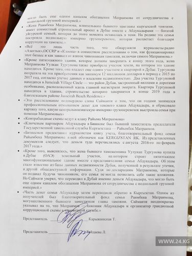 Доо арызда көрсөтүлгөндөй, Матраимовдордун үй-бүлөсүнүн пикиринде, бир канча фраза алардын намысына шек келтирүүдө. Мисалы, «Бир метри 1 доллар турган материал -кадимки велюр жүз миллион долларлык схемаларды ачууга жардам берет. Ошондой эле Кыргызстандан 100 миллион доллар чыгарылып кеткени уушул документтерден улам түшүнүктүү. Алар Матраимовдордун байлыктарынын сырын ачат», — деген сүйлөмдөр.