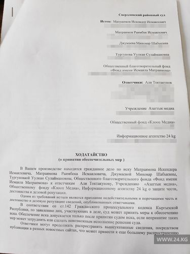 Свердлов райондук сотунда Матраимовдордун үй-бүлөсүнүн 24-kg.com, «Азаттык» жана Kloop ЖМКларына карата доо арызын кароо боюнча алдын ала угуулар башталды.