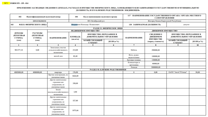2018-жылы гана Искендер Матраимов алгачкы жолу жубайынын бизнеси, «АвтоСТОлица» ЖЧК тууралуу отчетко жазган.