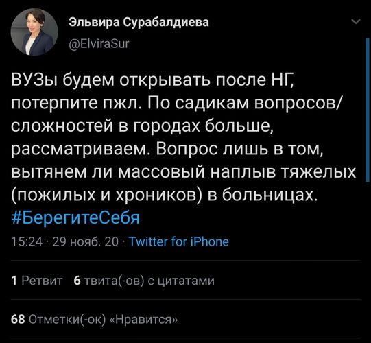 Жогорку окуу жайлары Жаңы жылдан кийин ачылат. Бул тууралуу өзүнүн Twitterдеги баракчасына вице-премьер-министр Эльвира Сурабалдиева жазып чыкты.