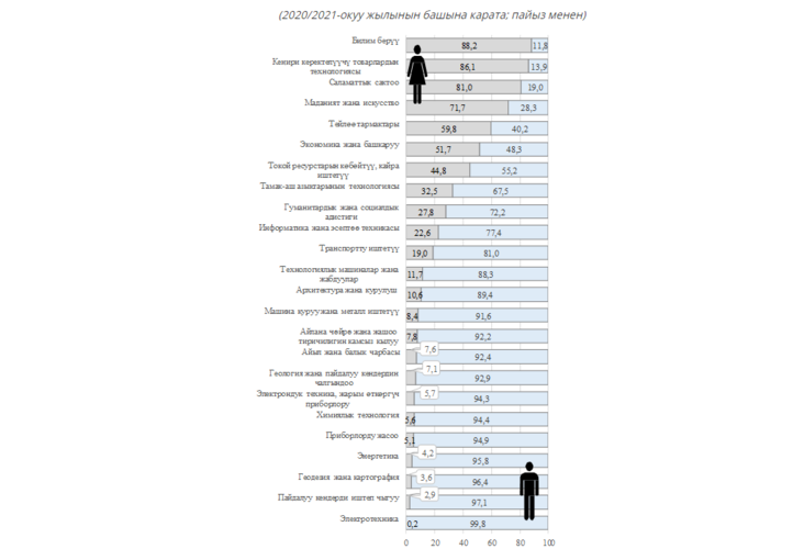 Ал эми архитектура жана курулуш багытындагы студенттердин 82 пайызы эркектер, айыл чарба илимдери −75%, техникалык −69%, юриспруденция — 66%.