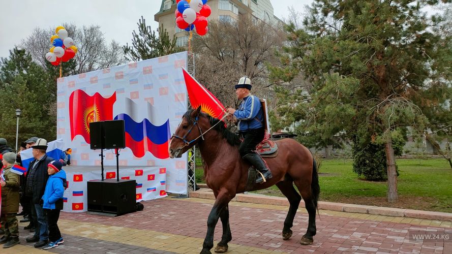 Бишкекте Россиянын Украинадагы операциясын колдогон митинг өтүп жатат. Ага катышкан жарандар Россиянын туусун көтөрүп чыгышты.