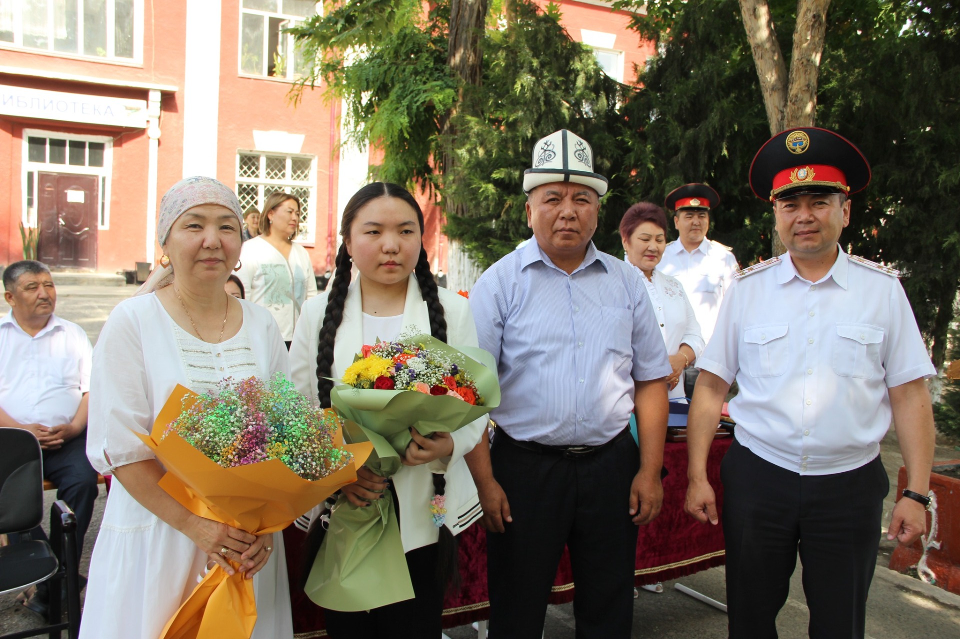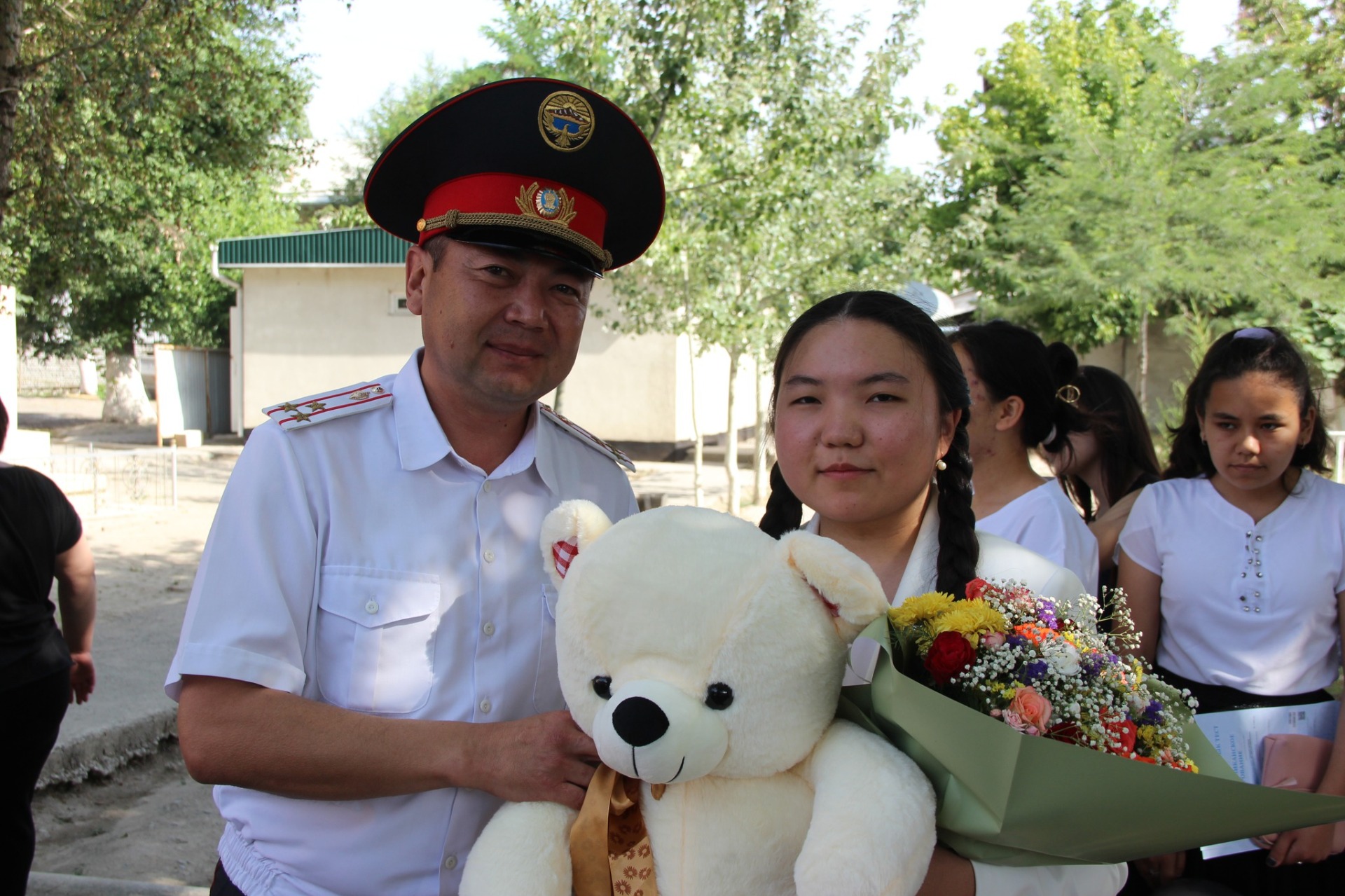 Ош шаардык ички иштер башкармалыгынын начальнигинин орун басары аталган мектептин аттестат тапшыруу салтанатына катышть.
