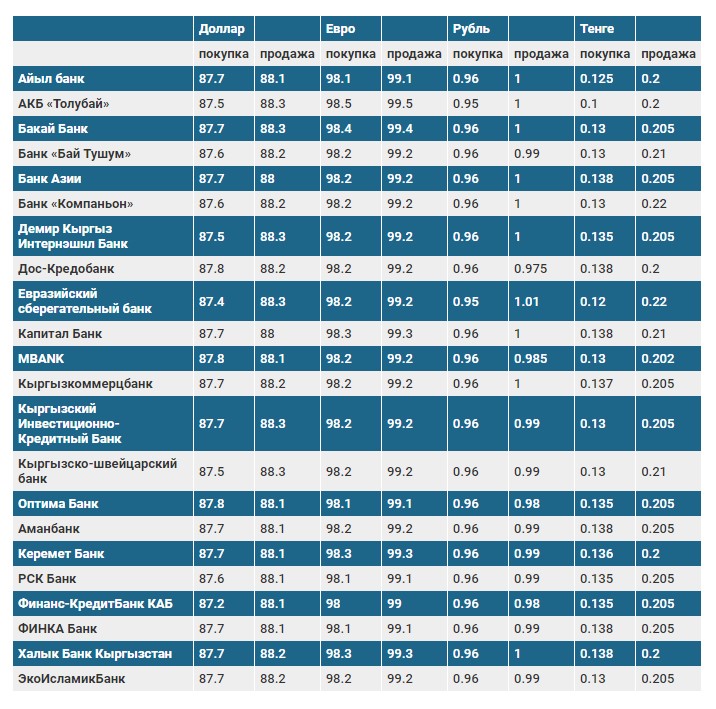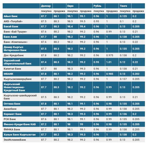 Валюталардын коммерциялык банктардагы бүгүнкү наркы