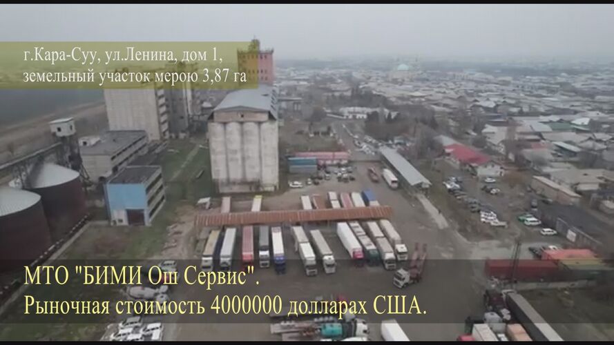 - Ош облусунун Кара-Суу районунун аймагындагы 3,87 гектар жер тилкеси менен «БИМИ Ош сервис» БКЖ (бажылык каттоо жери), алдын ала баасы 4 миллион долларды түзөт;