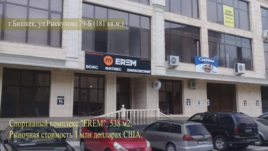 - Бишкек шаарынын Рыскулов көчөсүнүн 79 Б дарегинде жайгашкан «Эрем» спорт клубу, жалпы аянты 538 чарчы метр, болжолдуу баасы 1 миллион доллар;