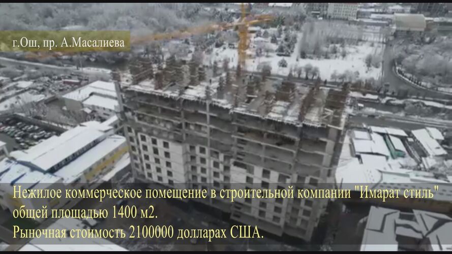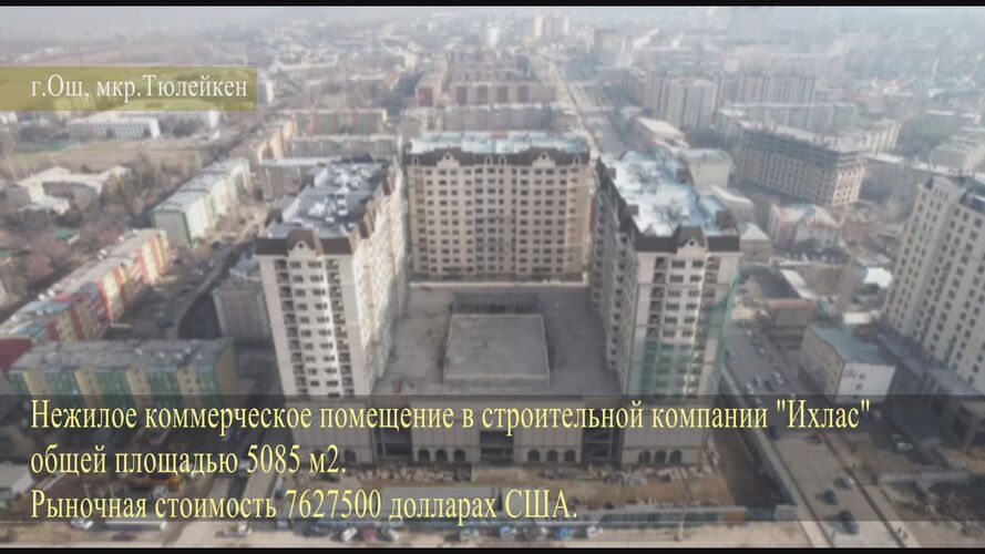 - Ош шаарындагы Төлөйкөн кичирайонунда жайгашкан «Ихлас» курулуш компаниясынын коммерциялык имараттары, жалпы аянты 5 миң 85 чарчы метр, алдын ала баасы 7 миллион 627 миң доллар;