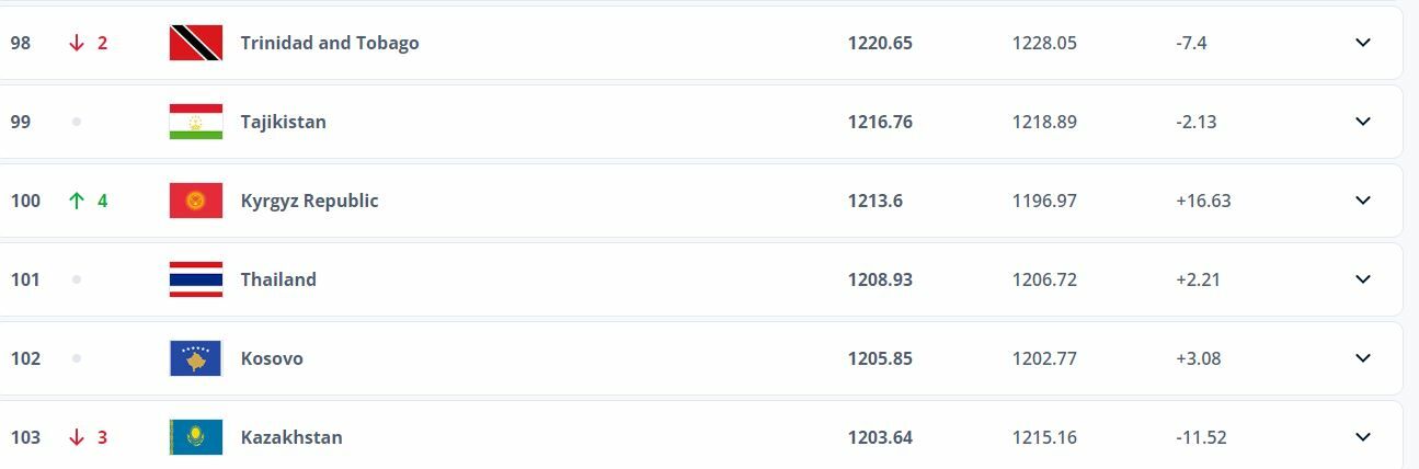 Кыргызстандын футбол боюнча курама командасы ФИФАнын рейтингинде 100 -орунга чыкты. Жаңыланган тизме эл аралык федерациянын сайтында жарыяланды.