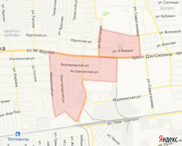 • Абаканов көчөсү — Дэн Сяопин проспектиси — Кустанай көчөсү — темир жол линиясы;