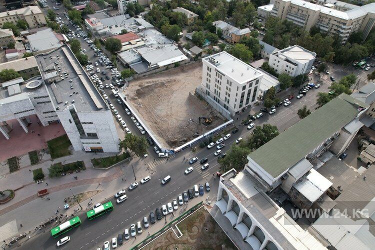 Буга чейин бул жерге пайдубалы үчүн чуңкур казып башташкан, бирок эмне курулаары тууралуу маалымат айтылган эмес. Сүрөттөргө караганда, чуңкур Орозбеков көчөсүнө чейин жетип, жолду тарытып салган. Мындан тышкары, Киев көчөсүндөгү тротуардын бир бөлүгү да ээлеп турат. Адамдар газондо басууга аргасыз болушууда.