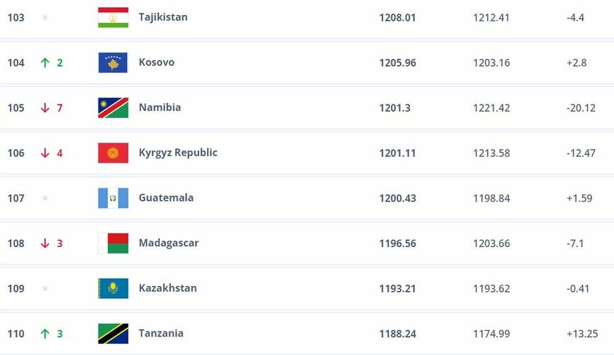 Азия чөлкөмүндө Кыргызстандын командасы бир орунга төмөндөп, 17-орунда турат.
