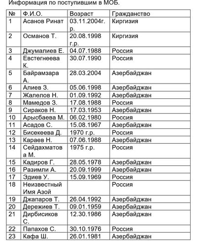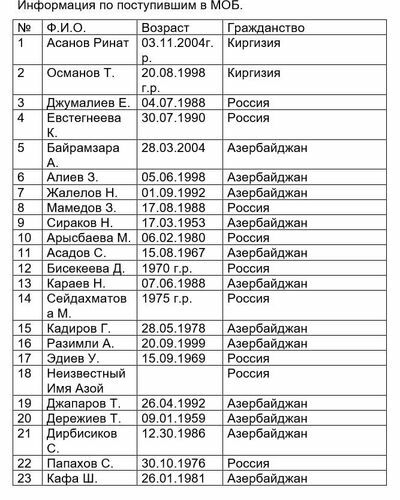 Орусиянын 10, Азербайжандын 14, Кыргызстандын 2, Германиянын 1 жараны (жарандыгы белгисиз), дагы эки жарандыгы белгисиз ооруканага жаткырылды. Жарыяланган тизмеге ылайык, аман калган кыргызстандыктар 26 жаштагы Тилек Османов жана 20 жаштагы Ринат Асанов.