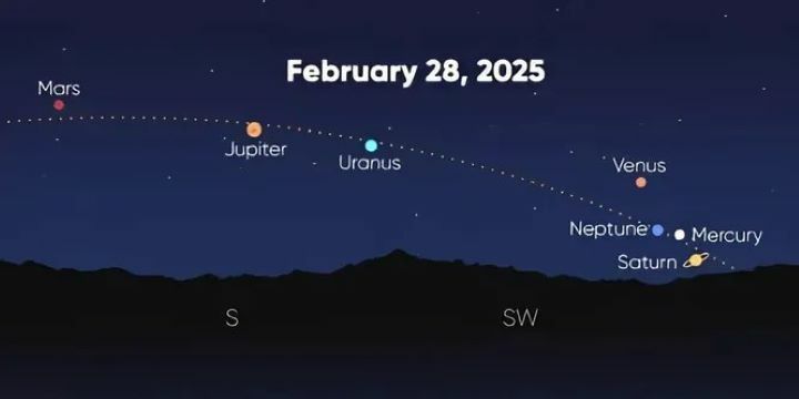 Ал эми 28-февралда Меркурий планеталардын бул парадына кошулат. Чындыгында Жерден башка Күн системасынын бардык планеталарынын парадын көрүүгө болот.