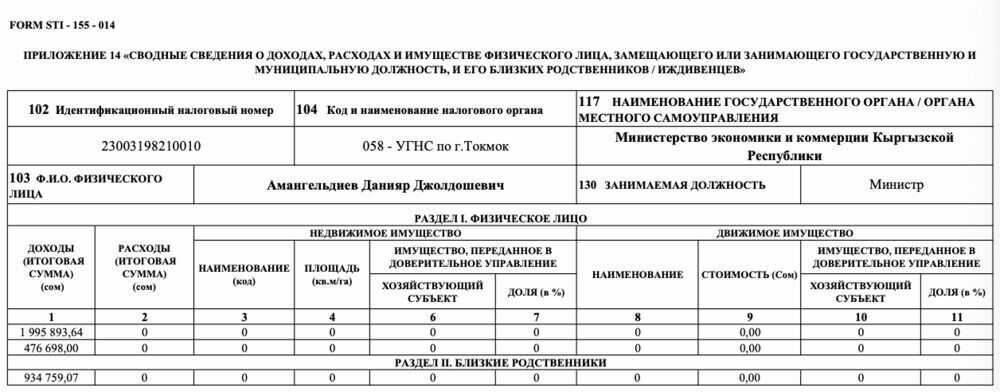 Салык кызматы мамлекеттик кызматкерлердин 2023-жылга кирешеси тууралуу декларациясын жарыялай баштады. Ошондой эле министрлер кабинетинин төрагасынын азыркы биринчи орун басары, Экономика жана коммерция министрлигинин мурдагы жетекчиси Данияр Амангелдиевдин кирешеси жана мүлкү тууралуу маалыматтар келтирилди.