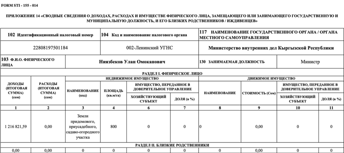Ички иштер министрлигинин жетекчисинин декларациясында унаасы бар же жакын туугандарынын кирешеси тууралуу маалымат жок.