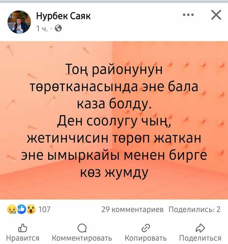 Ысык-Көл облусунун Тоң районундагы төрөт үйүндө кош бойлуу аял каза болду. Бала да чарчап калган. Бул тууралуу Нурбек Саяк социалдык тармактарга билдирди.