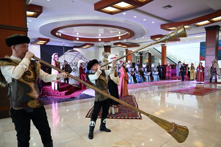 Мамлекет башчылары кыргыз жана тажик музыкалык чыгармаларын аткарган кыргыз артисттеринин катышуусундагы концерттик программаны көрүштү.