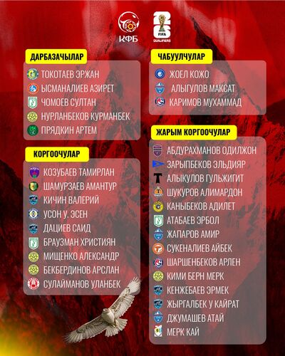 Футбол боюнча Кыргызстан курама командасынын 2026-жылы өтө турган Дүйнө чемпиондугунун тандоо раундунда боло турган оюндарга катыша турган кеңейтилген тизмеси жарыяланды. Бул тууралуу Кыргызстандын футбол биримдиги социалдык тармактарда билдирди.