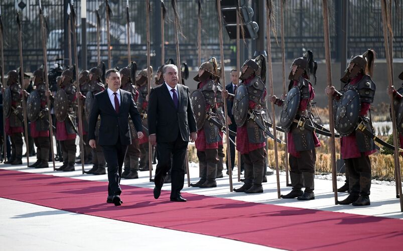 Кыргызстанга мамлекеттик сапар менен келген Рахмондун кортежи атчан эскорттун коштоосунда «Ынтымак Ордо» имаратына келди. Имараттын флагштокторуна Кыргызстандын жана Тажикстандын мамлекеттик желектери илинип, эки өлкөнүн гимни жаңырып, ардактуу кароолдун тизилүүсү менен аскердик парад өттү.