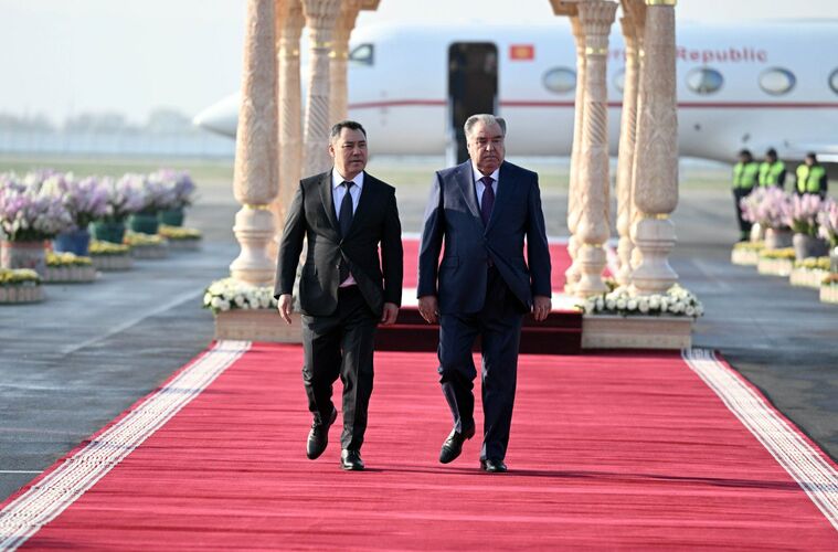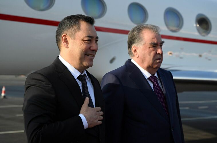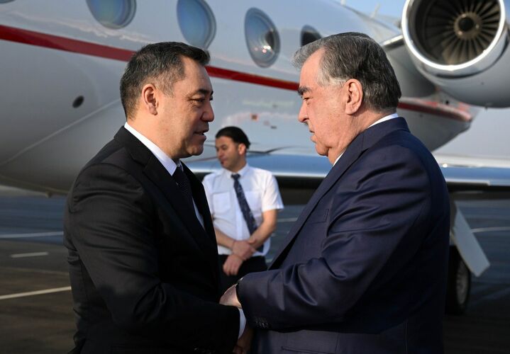 Мамлекет башчысынын борту Худжанд эл аралык аэропортуна конду. Президент Садыр Жапаровду Тажикстандын Президенти Эмомали Рахмон тосуп алды.