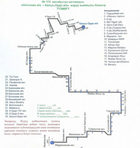 № 175 автобустун каттамы өзгөрөт. Ал убактылуу Масалиев, Бакаев жана Абдрахманов көчөлөрү аркылуу Ынтымак турак жай комплекси — Калыс Ордо турак жай комплекси багытында өтөт.