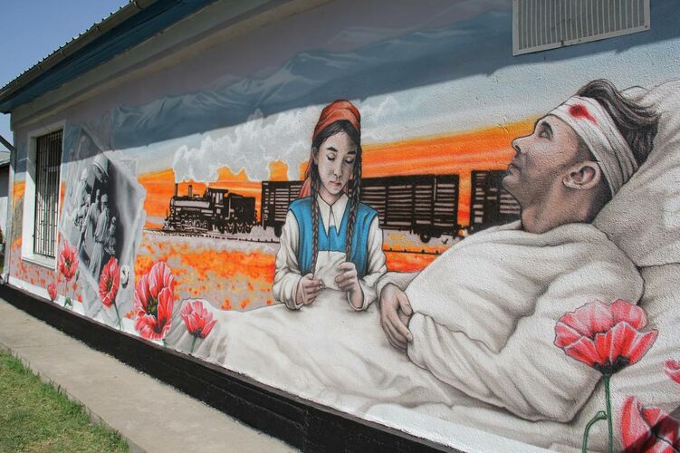 Кант шаарында № 5 орто мектептин фасадына Улуу Ата Мекендик согуштагы кыргызстандыктардын эрдигине арналган жаңы мурал тартылды. Дубалда ооруканада жарадар болгон жоокерге жардам көрсөтүп жаткан дарыгер аялдын сүрөтү түшүрүлдү.