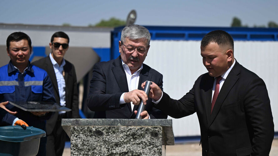 Министрлер кабинетинин төрагасы Адылбек Касымалиев Талас шаарында асфальт-бетон, темир-бетон жана таш майдалоочу заводдорун куруу үчүн капсула салуу аземине катышты.