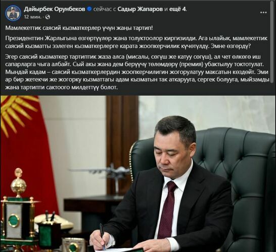 «Мындай кадам саясий кызматкерлердин жоопкерчилигин жогорулатуу максатын көздөйт. Эми ар бир жетекчи же жогорку кызматтагы адам кызматын так аткарууга, сергек болууга, мыйзамды жана тартипти сактоого милдеттүү болот», — деп жазды ал.
