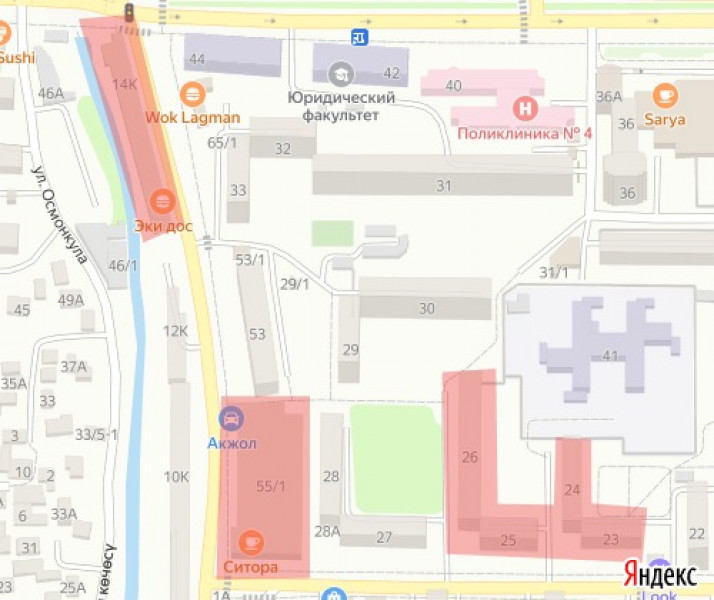 «Чыгыш-5» кичирайону — Төрөкул Айтматов көчөсүндөгү No23, 24, 25, 26, 55 турак үйлөр, «Фастфуд».