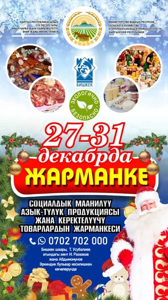Бишкек шаарында Жаңы жыл майрамына карата 27-декабрдан 31-декабрга чейин жарманке күн сайын уюштурулат. Бул тууралуу Суу ресурстары, айыл чарба жана кайра иштетүү өнөр жайы министрлиги кабарлады.