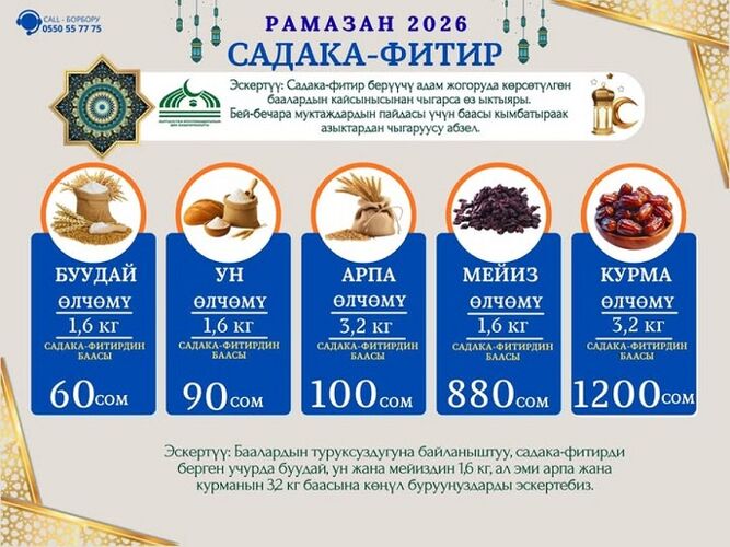 Кыргызстан мусулмандарынын дин башкармалыгы 2026-жылга карата битир-садаканын өлчөмүн бекитти. Бул тууралуу мекеменин басма сөз кызматы билдирди.