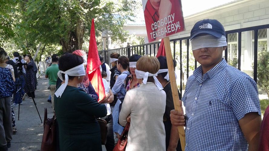 Биринчи май райондук сотунун алдында Өмүрбек Текебаевдин тарапташтары көзүн ак кездеме менен байлап пикет өткөрүшүүдө. Алар бул кадамы менен сот Айбек Эрнис уулунун видео-фотого тартууга тыюу салган чечимине каршылык билдиришет.