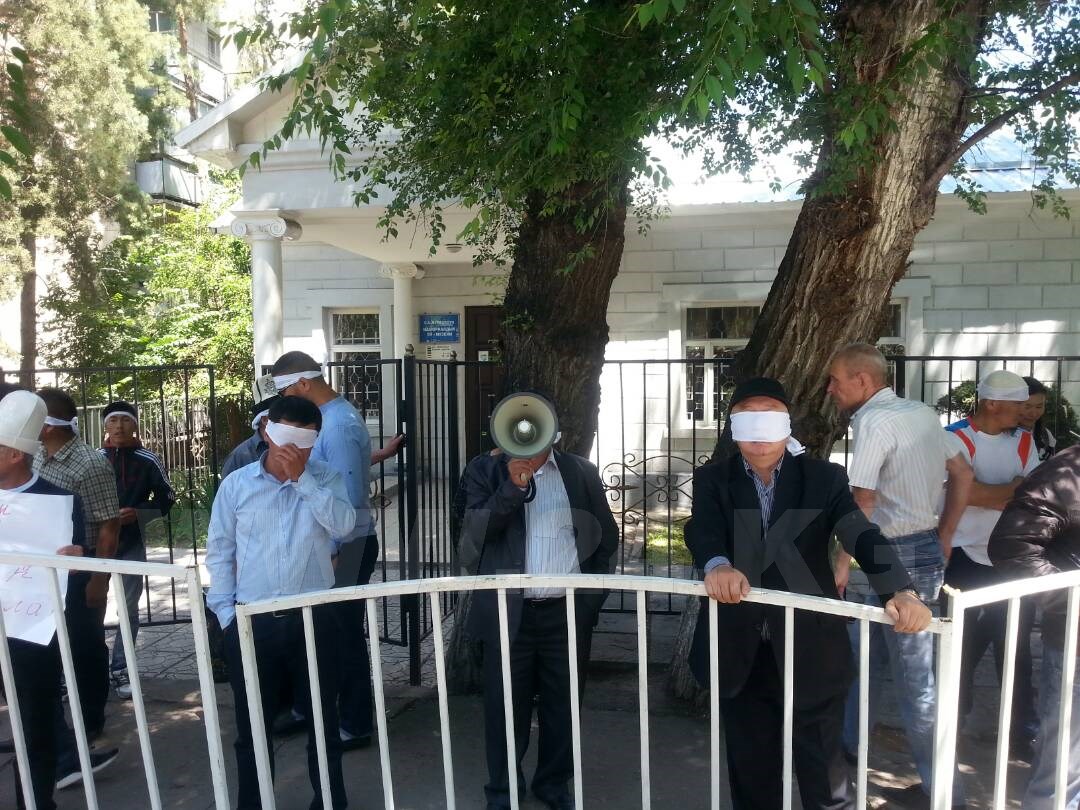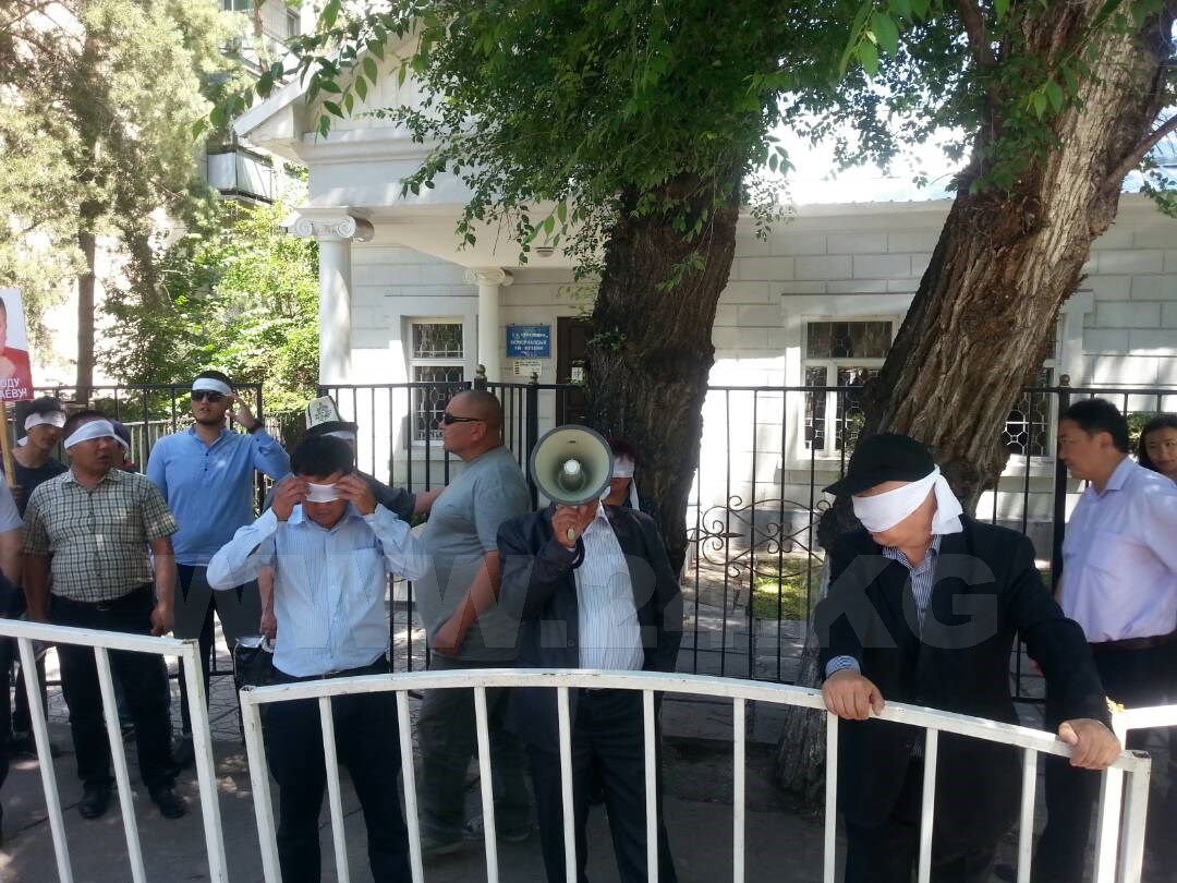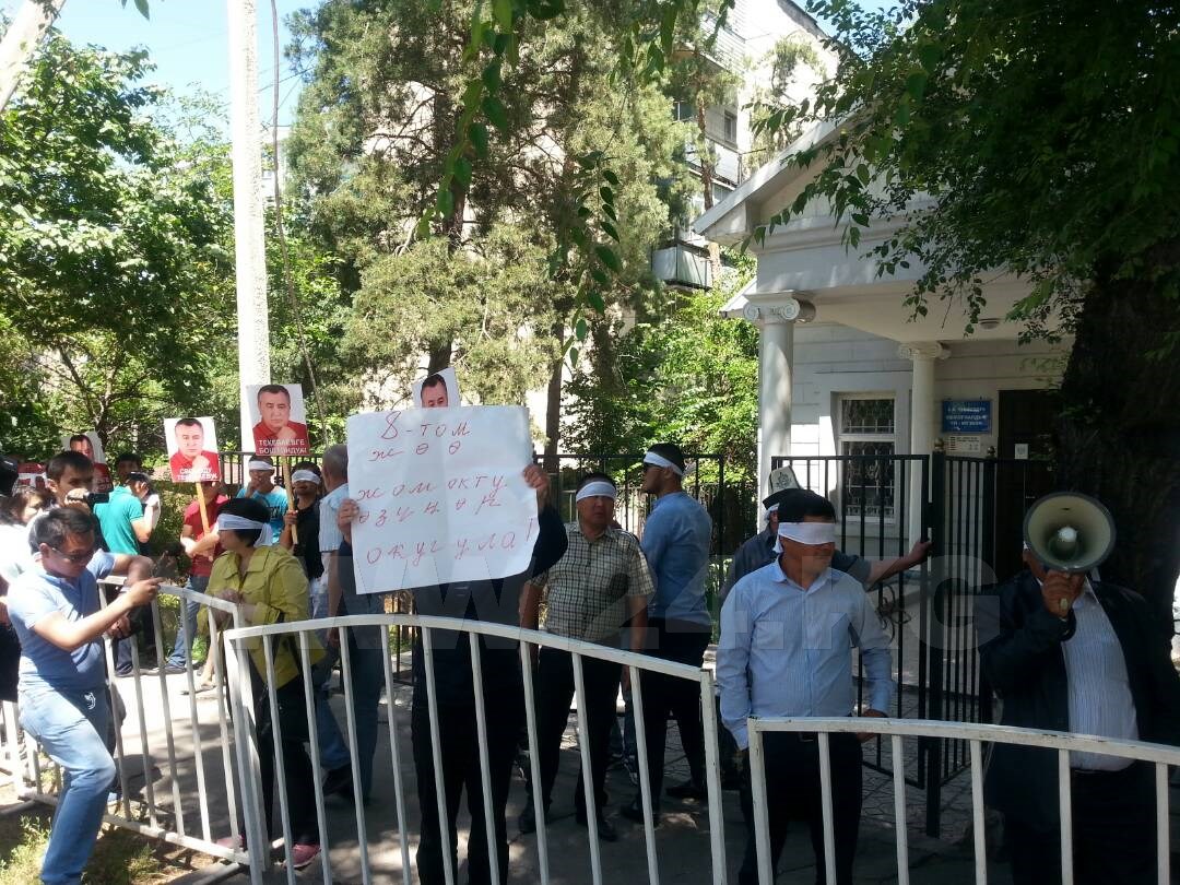 «Текебаевге эркиндик!», «Чотоновго эркиндик!», «Сот эл алдында ачык өтсүн!» — деген талаптар менен партиянын өкүлдөрү көзүнө ак кездеме байлап турушат.
