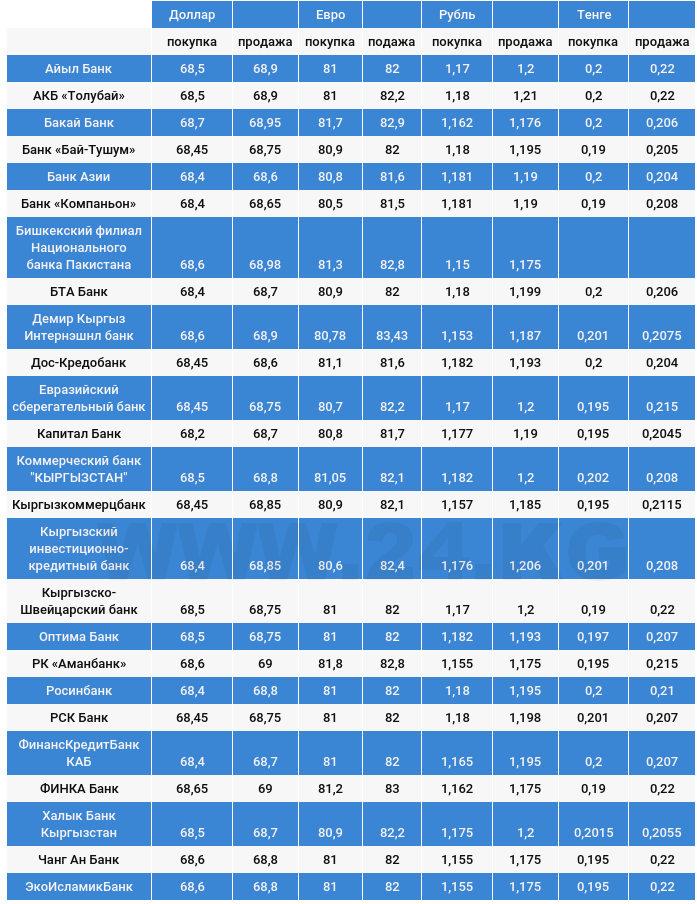 Доллардын жана башка валюталардын коммерциялык банктардагы сомго карата наркы.