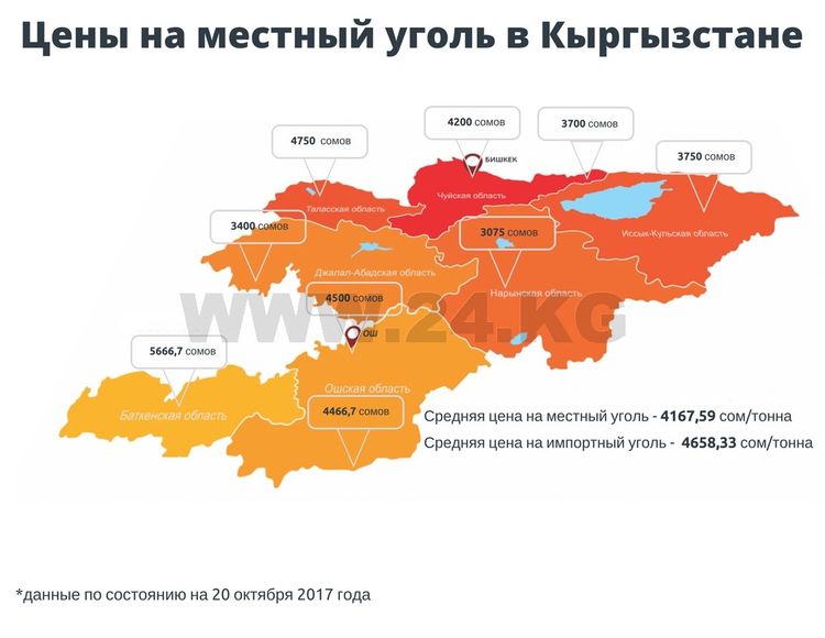 20-октябрга карата жергиликтүү көмүрдүн орточо баасы 4 миң 167, 59 сом, импорттуку 4 миң 658, 33 сом болду.