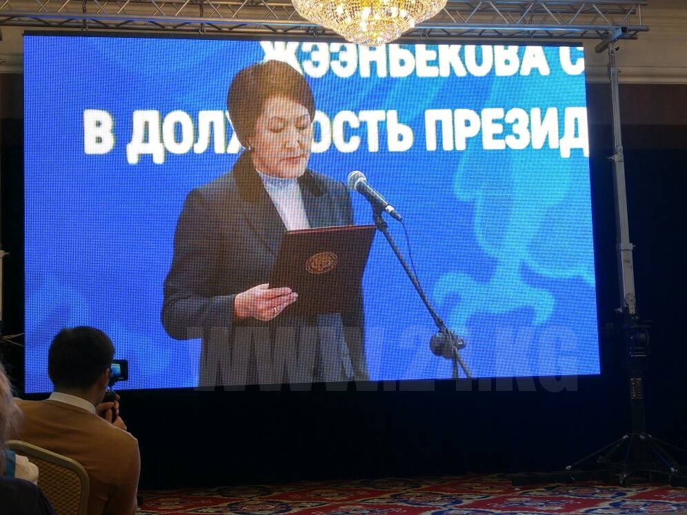 Инаугурацияда Шайлоо комиссиясынын төрайымы Нуржан Шайлдабекова Сооронбай Жээнбековго атайын ал үчүн жасалган төш белги, күбөлүгүн жана штандартын тапшырды.