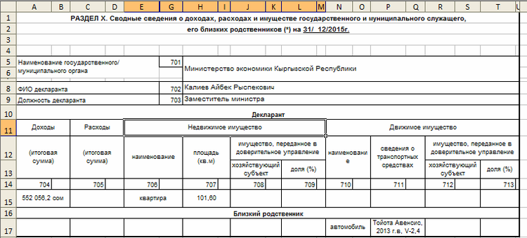 Сатылган кыймылсыз мүлкү үчүн 4,5 миллион сом алган. Ал эми жакын тууганынын кирешеси 690 миң сомду түзгөн.