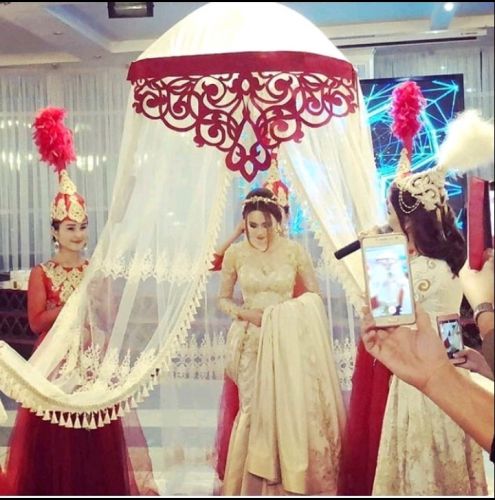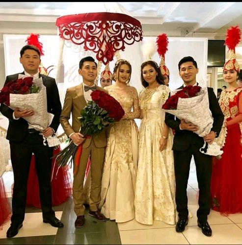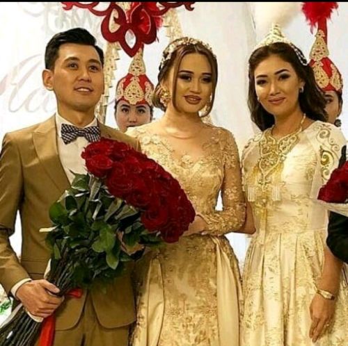 Жаштардын тоюна тууган уруктарынан тышкары, чыгармачыл чөйрөдөгү достору дагы күбө болду. Тамада күйөө жигитти кучак толо гүлү менен чакырып алган соң, келинди ырчы Анжелика жар-жар айтып коштоп чыкты.