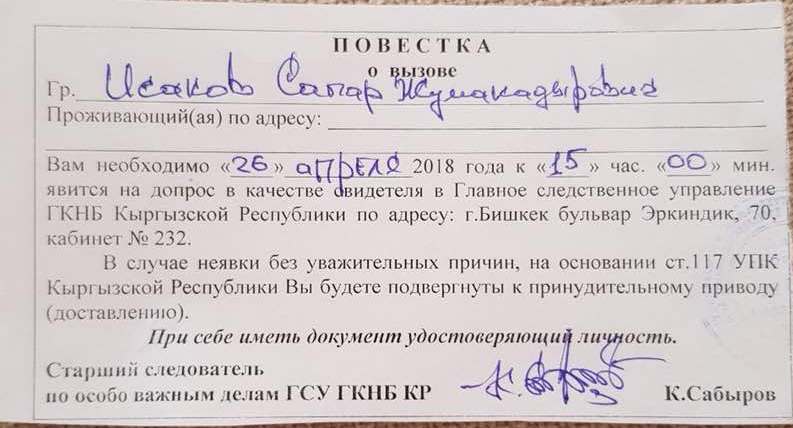 Чакыруу кагазында бүгүн, саат 15.00гө УКМКнын № 232-иш бөлмөсүнө келүүсү керек экени көрсөтүлгөн. Ал күбө катары сурак бере турганы маалымдалган. Бирок Исаковдун кайсыл иш боюнча сурак бере турганы тууралуу маалыматы жок.