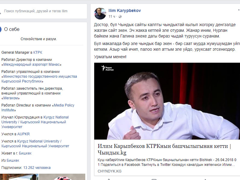 «Достор, бул «Чындык» сайты калпты чындыктай кылып жогорку деңгээлде жазган сайт экен. Эч жакка кетпей эле отурам. Жанар иним, Нурлан байкем жана Галина эжеке дагы бир аз чыдай туруусун суранам. Бул макалада бир эле чындык бар экен. Бир саат мурда жумушумдан үйгө кеткеним. Азыр чай ичип, палоо жеп аттым эле, уруксаат этсеңиздер», — деген билдирүү калтырган Карыпбеков.
