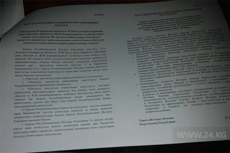 Ошондой эле 386 миллион доллар тууралуу насыялык макулдашуу англис тилинде түзүлүп, ага ошол кездеги каржы министри Ольга Лаврова кол койгон. Бирок өкмөт макулдашуунун долбоору менен орус тилинде таанышкан.Корутундуда ЖЭБ айрым курулуш иштери толук аяктай электе эле ишке берилгени жазылган. Депутаттар Башкы прокуратураны жана УКМКны 386 миллион доллардын максаттуу пайдаланылганы жана ТВЕАдин жалданууларынын аткаминерлер менен биргелешип иш алып баруусун текшерүүгө чакырды.