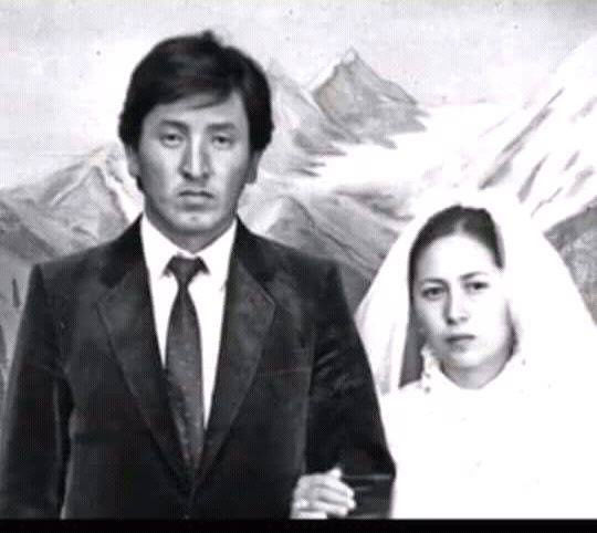 Сүрөт мамлекет башчысы Сооронбай Жээнбеков менен жубайы Айгүл Токоева баш кошкон күнү тартылган.
